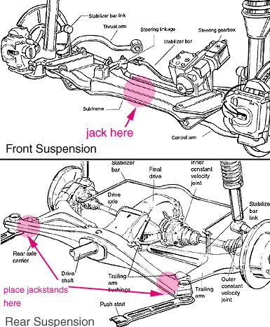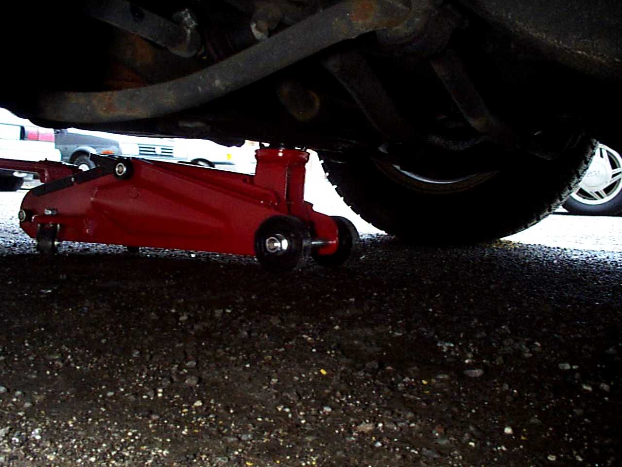 Step 1: place the hand brake on very tightly. start with the front of the car; position the jack under the subframe just behind the oil pan. make sure you don't jacl using the oil pan for obvious reasons! if you can, use a thin piece of wood or a few layers of cardboard between the jack saddle and the subframe |