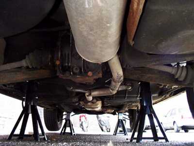 Step 4: place the rear jack stands under the side arms of the rear axle carrier on either side. make sure, as with the front, that the stands are sitting flat on the carrier and flat on the ground. lower the car unto the rear stands and watch the front ones don't move. if the front ones move but the car is now on all four stands, go back to the front and rejack and reseat the jack stands. |